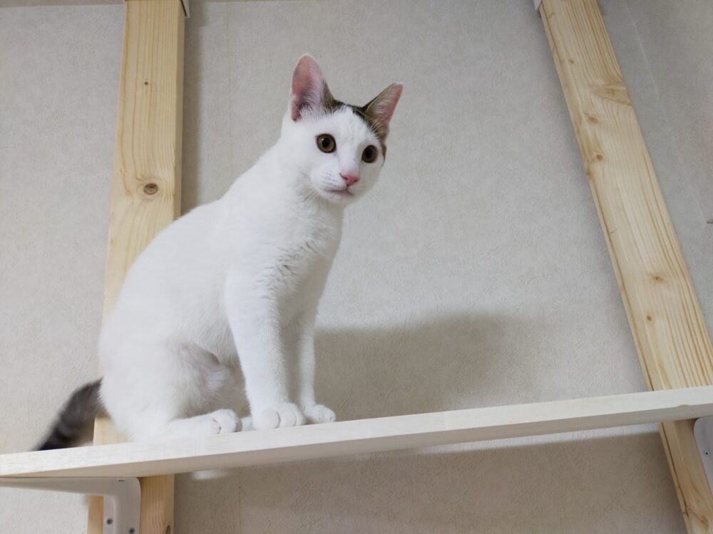 我が家では、壁に柱を立てて棚板をつけた自家製のキャットタワーとキャットウォークを用意しました。