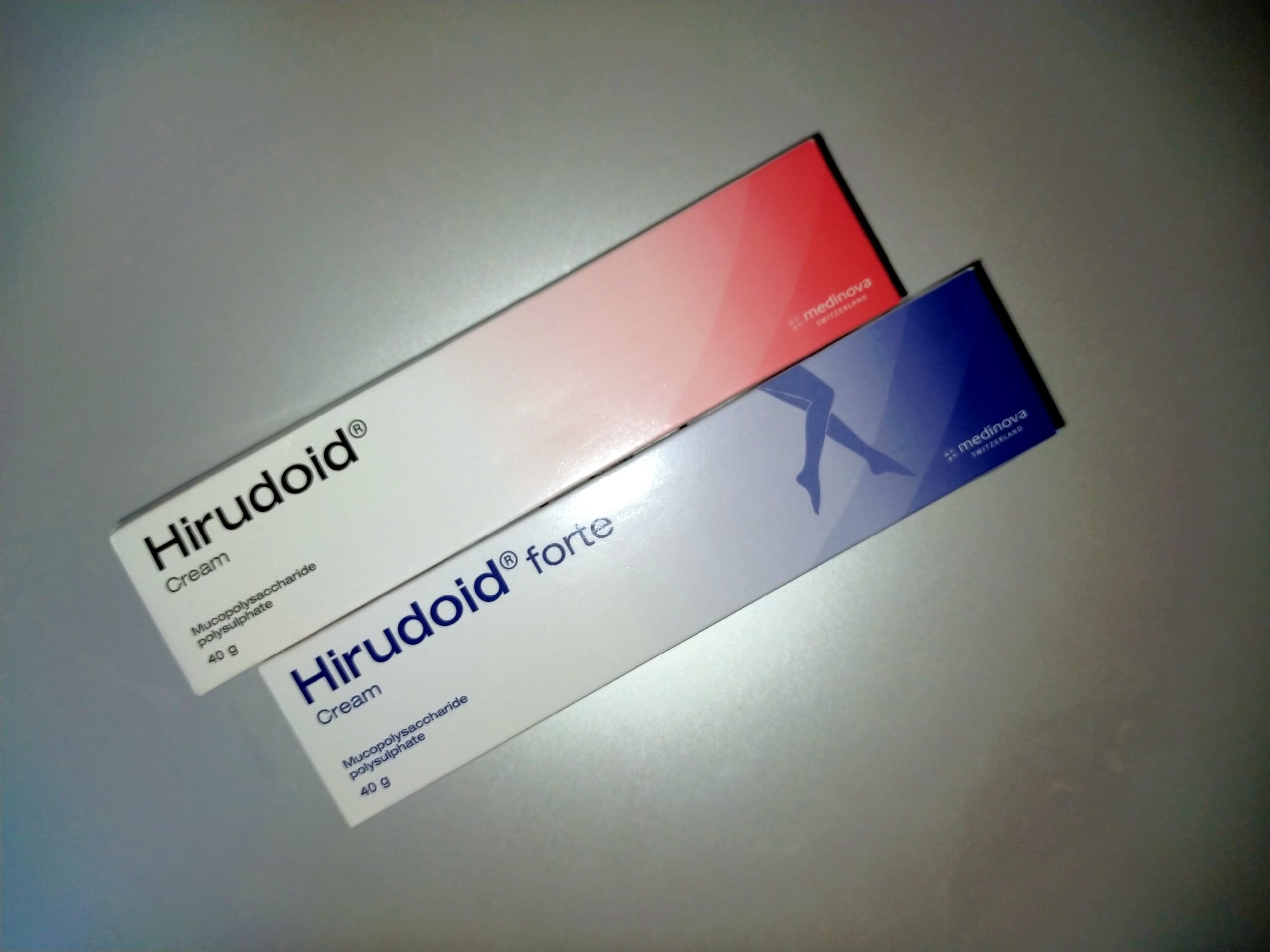 「Hirudoid」は赤い箱の製品で、「Hirudoid Forte」は青い箱の商品になります。
